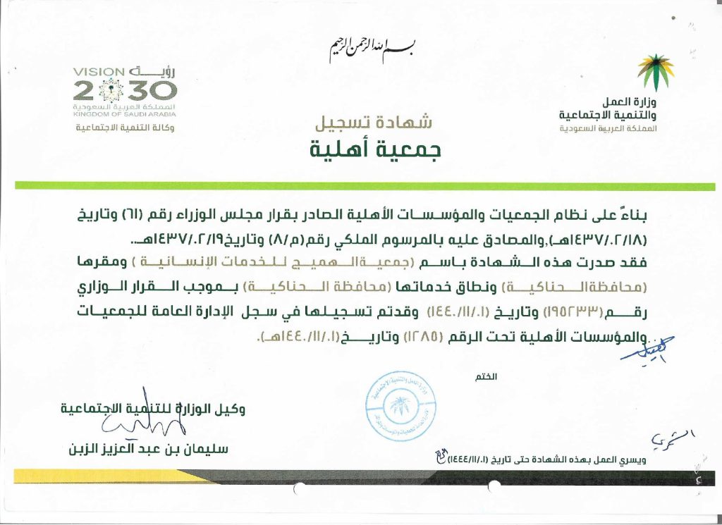 شهادة تسجيل الجمعية